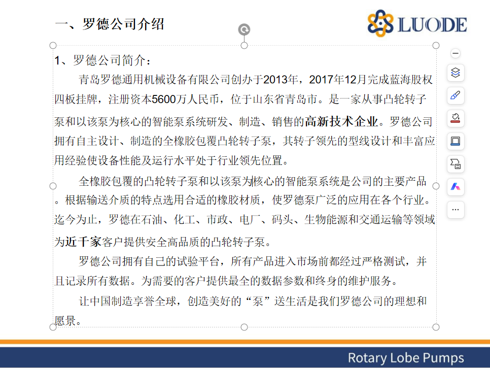 青島羅德通用機械設(shè)備有限公司創(chuàng)辦于2013年,2017年12月完成藍海股權(quán)四板掛牌 ,注冊資本5600萬元人民幣,位于山東省青島市,是一家從事凸輪轉(zhuǎn)子泵和以該泵為核心的智能泵系統(tǒng)的研發(fā)、制造、銷售的高新技術(shù)企業(yè)。公司研發(fā)實力雄厚,擁有自主設(shè)計、制造的全橡膠包覆凸輪轉(zhuǎn)子泵,其領(lǐng)先的型線設(shè)計和豐富應(yīng)用經(jīng)驗使設(shè)備性能及運營水平處于領(lǐng)先位置。