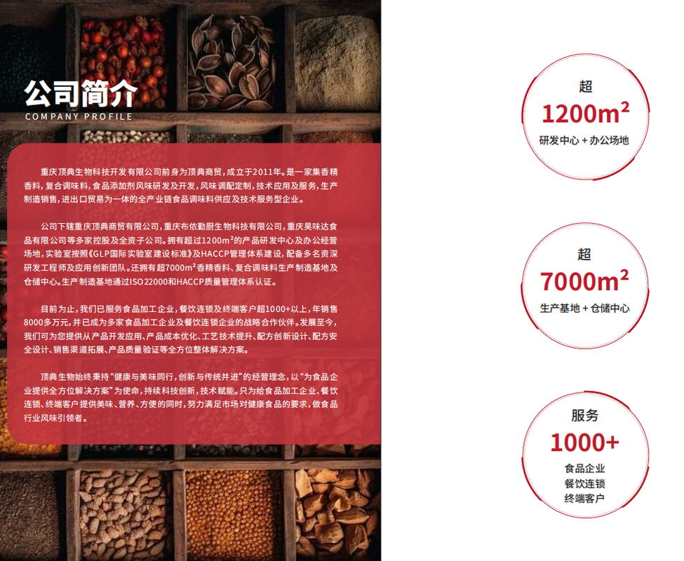 重慶頂?shù)渖锟萍奸_發(fā)有限公司是中國香料香精、復(fù)合調(diào)味料及食品添加劑行業(yè)的技術(shù)服務(wù)型領(lǐng)軍企業(yè)。以 “為客戶提供健康優(yōu)質(zhì)的前沿美味” 為經(jīng)營主題,年度銷售額超 4000 萬元,連續(xù)入圍 “重慶市最具潛力發(fā)展民營企業(yè)” 提名,致力于成為國內(nèi)一流的食品服務(wù)供應(yīng)商。